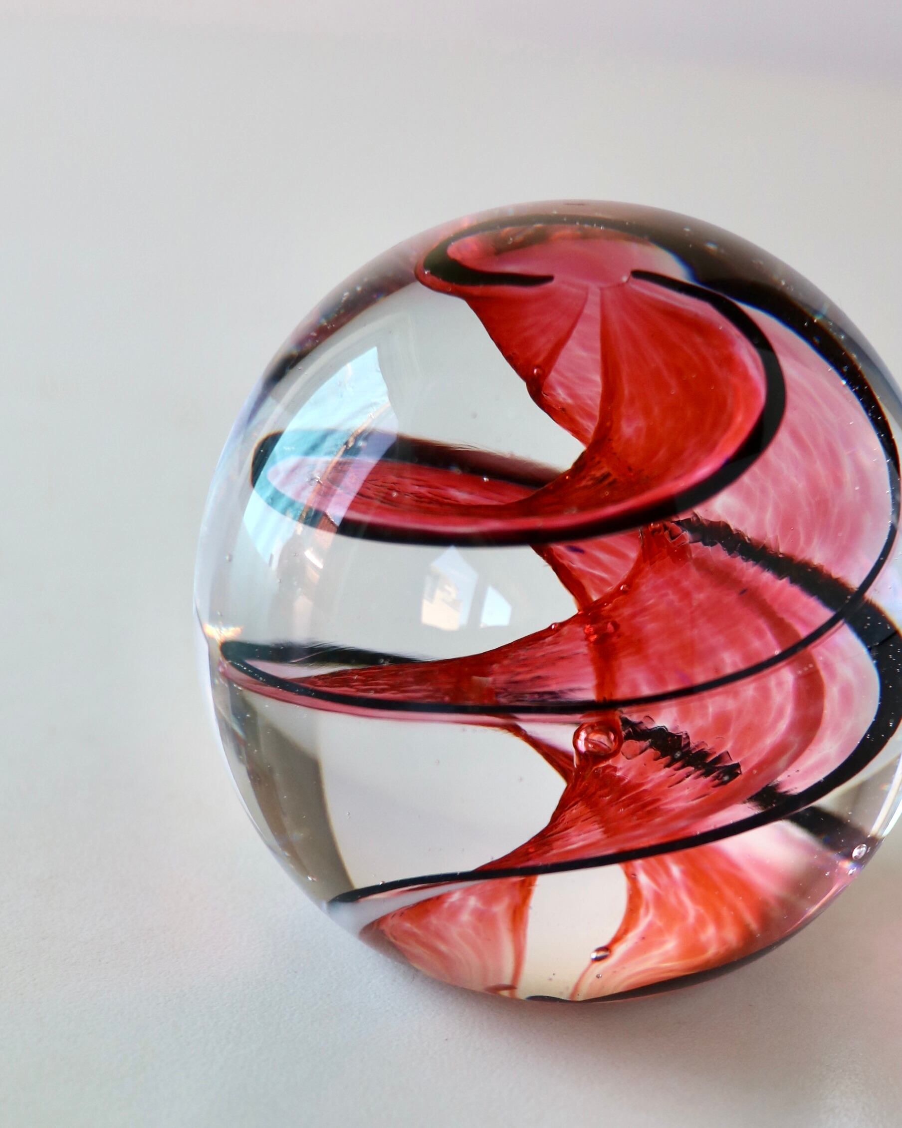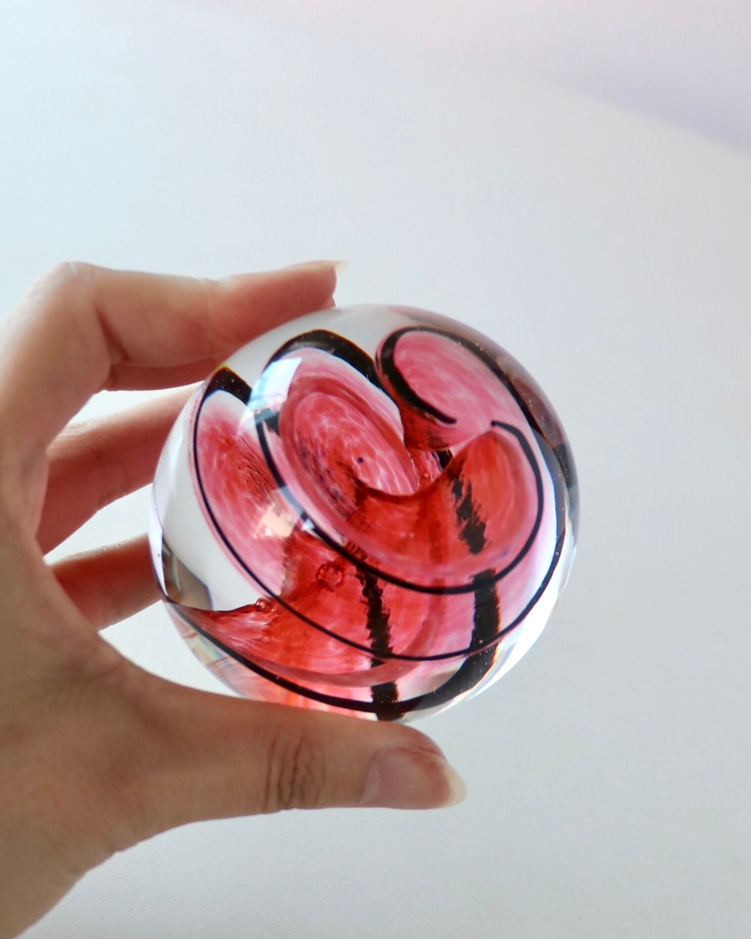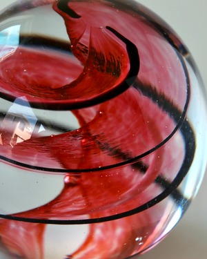クリアガラスに浮かぶのは、黒の縁取りが施されたまだらピンクの渦巻き模様。