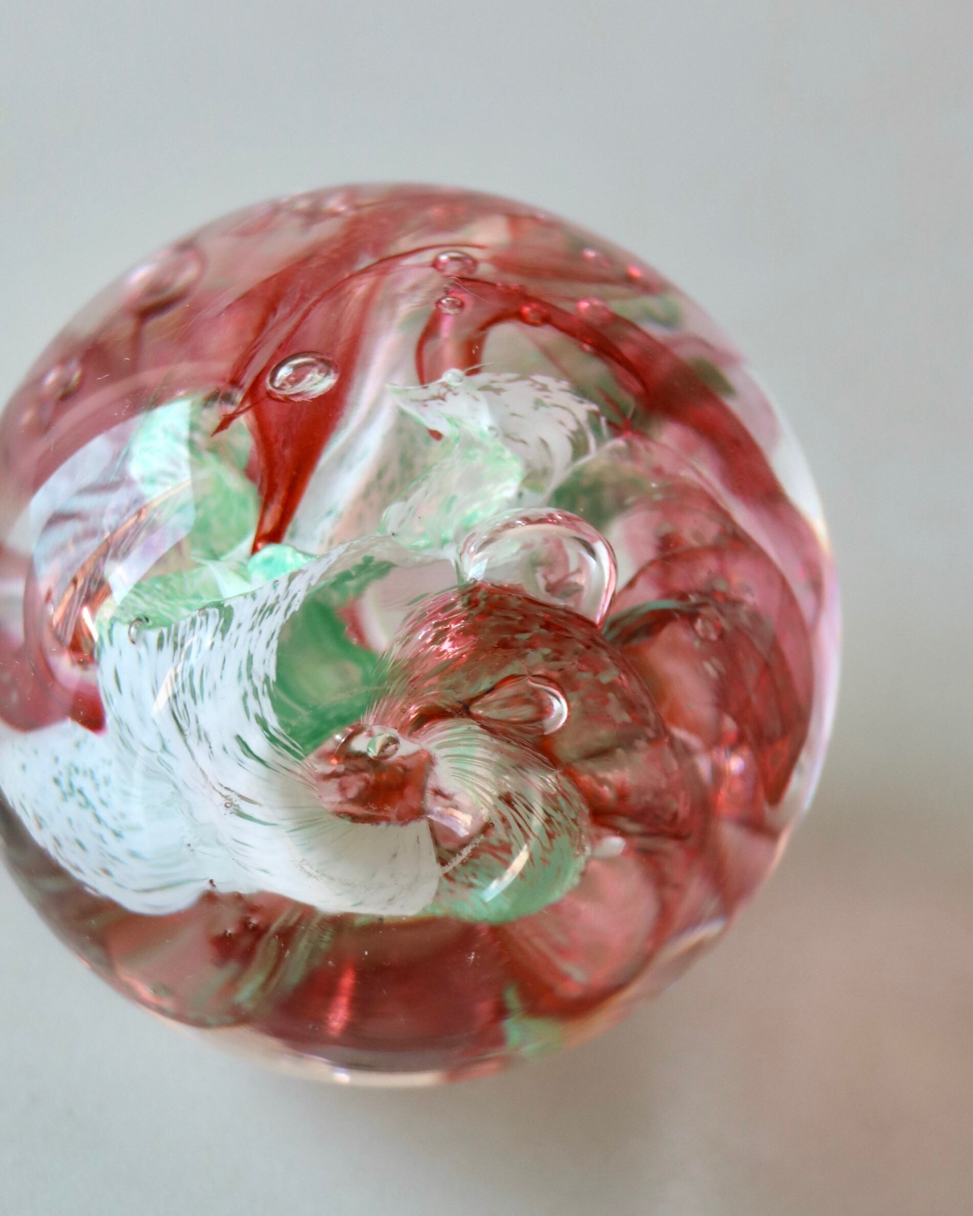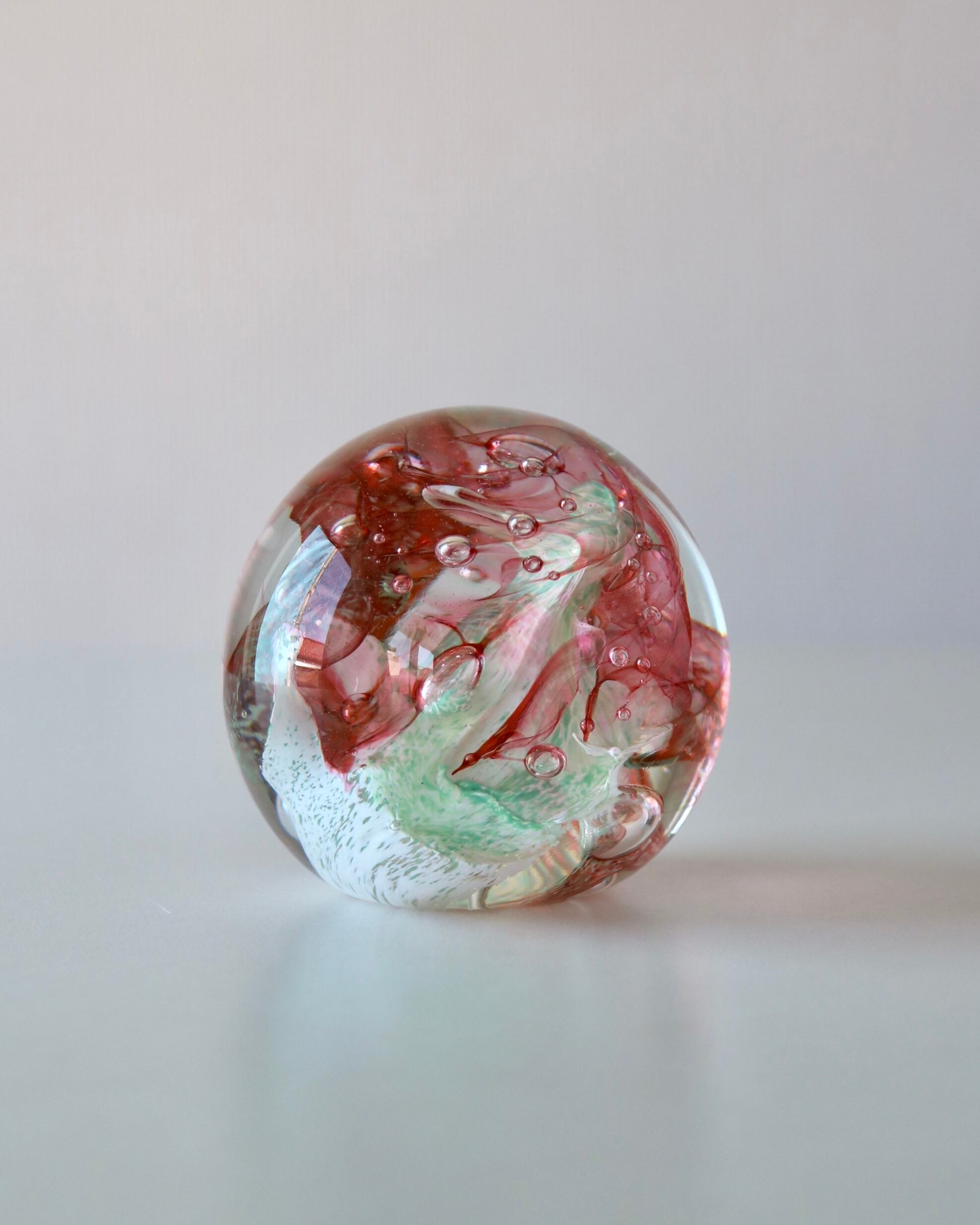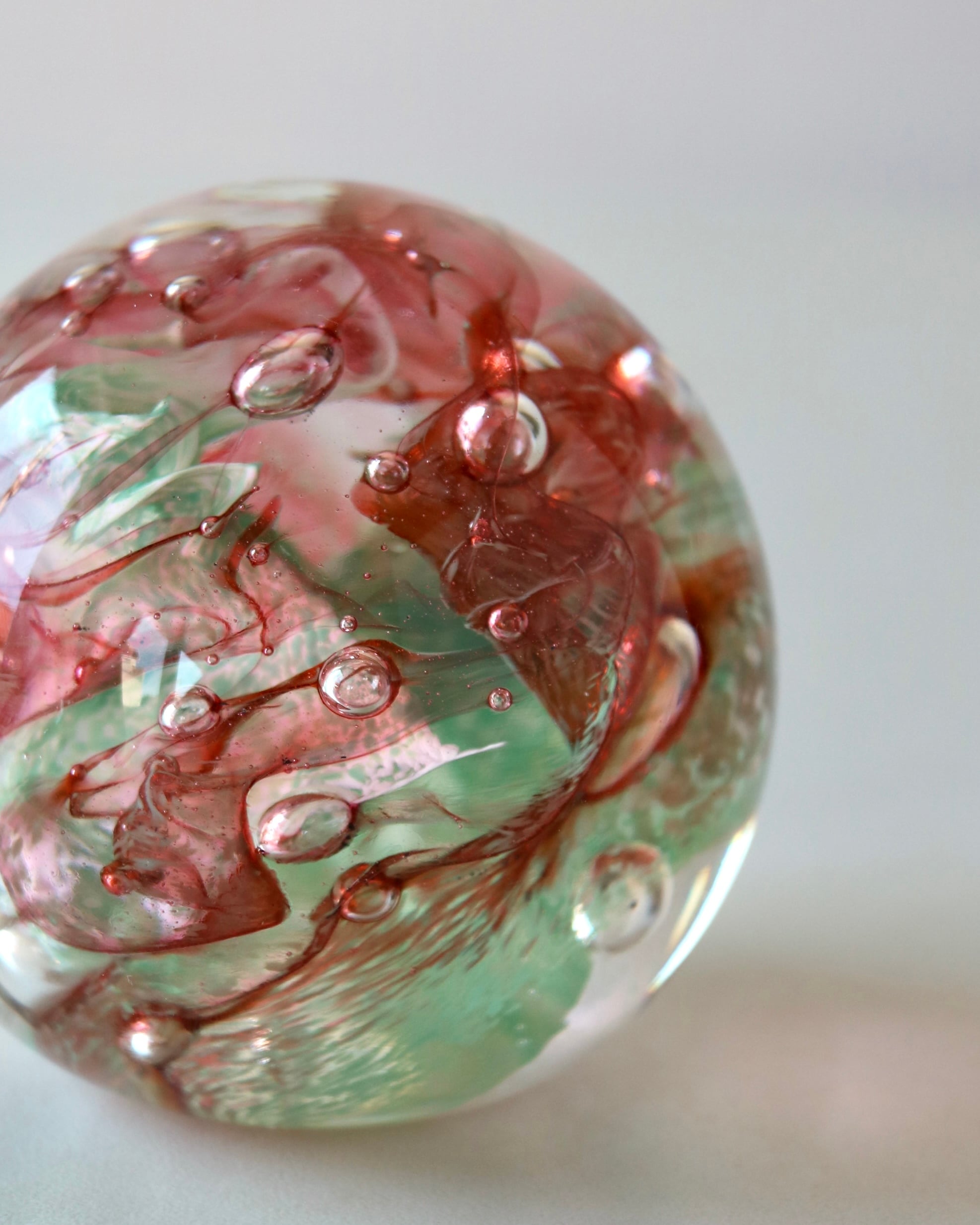 クリアガラスに透けて漂うスモーキーピンクに、印象的なライトグリーンのアクセント、そしてパールのように艶めく気泡。