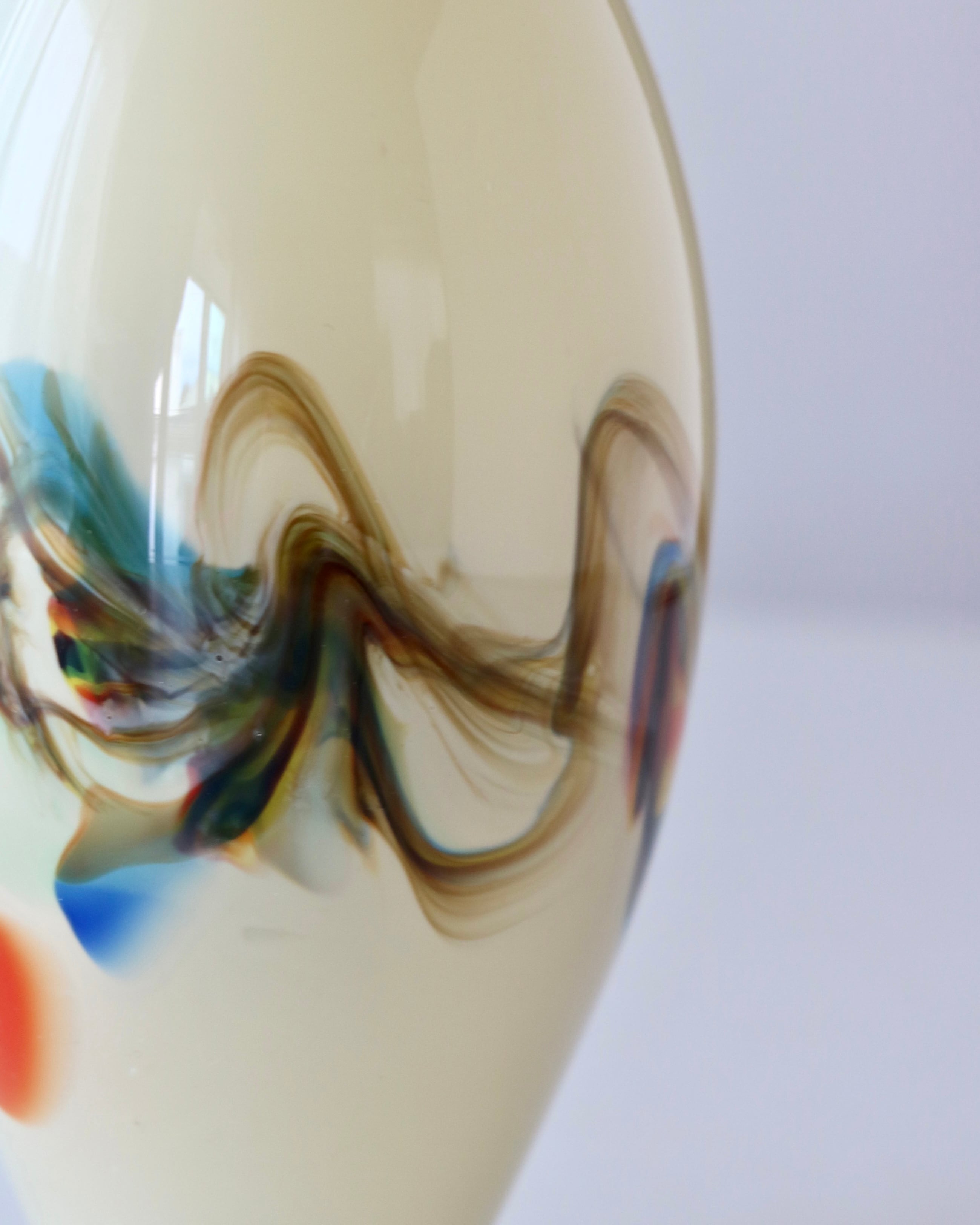 アイボリーのオパリンガラス、ブラウンやブルー・オレンジなどのマーブル、それらを閉じ込めるグリアガラスと、3層のガラスから構成された凝った作りがアートな佇まい。