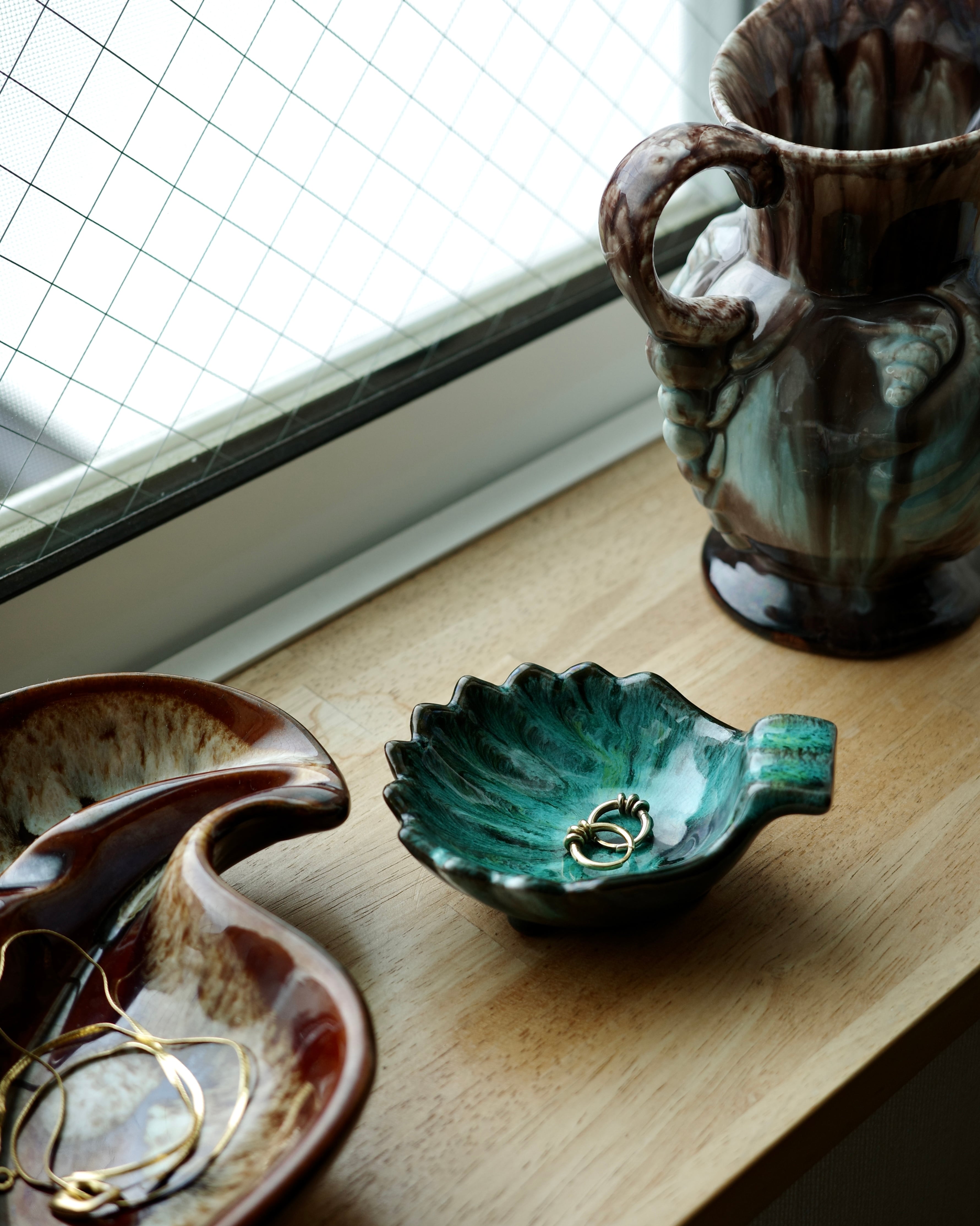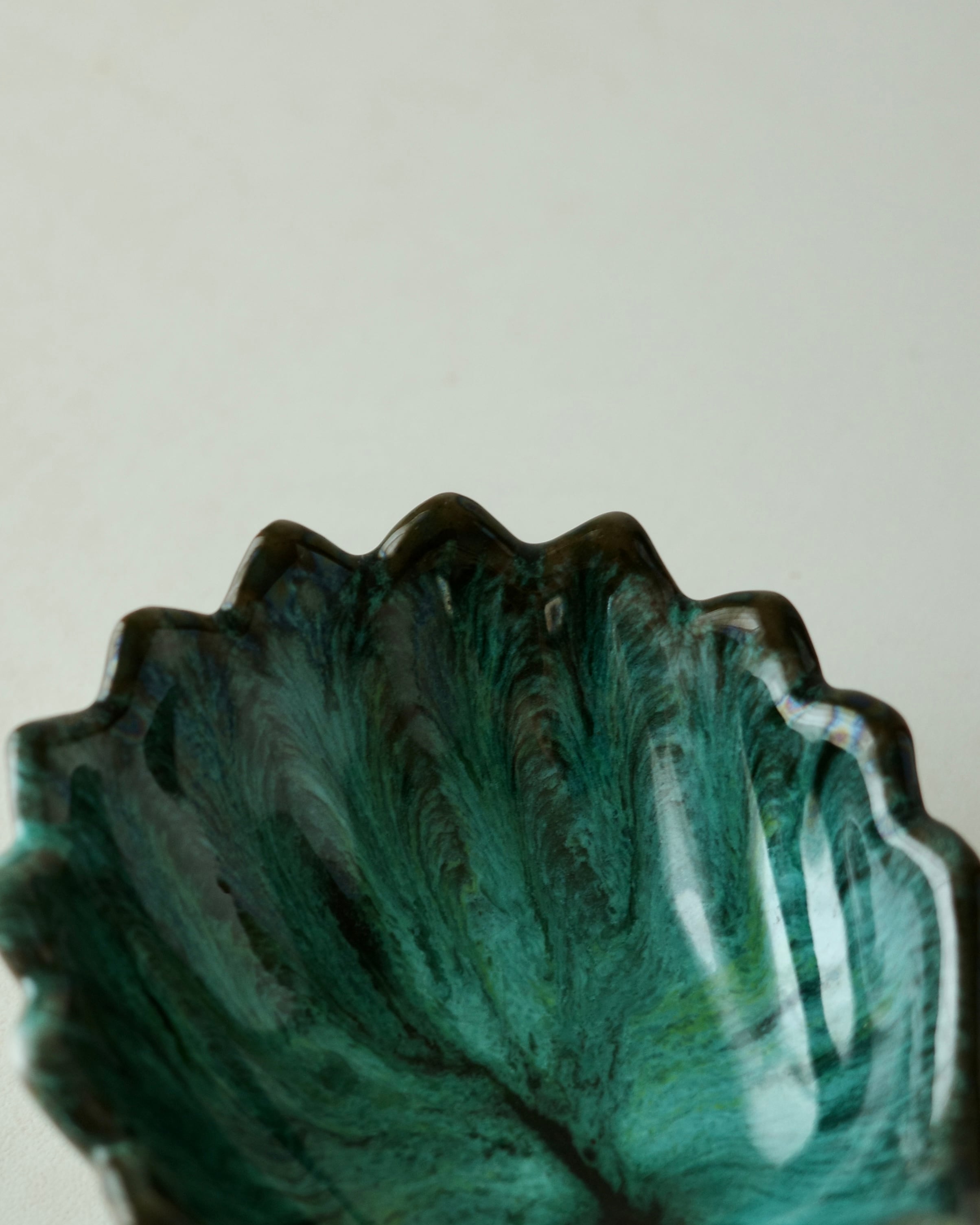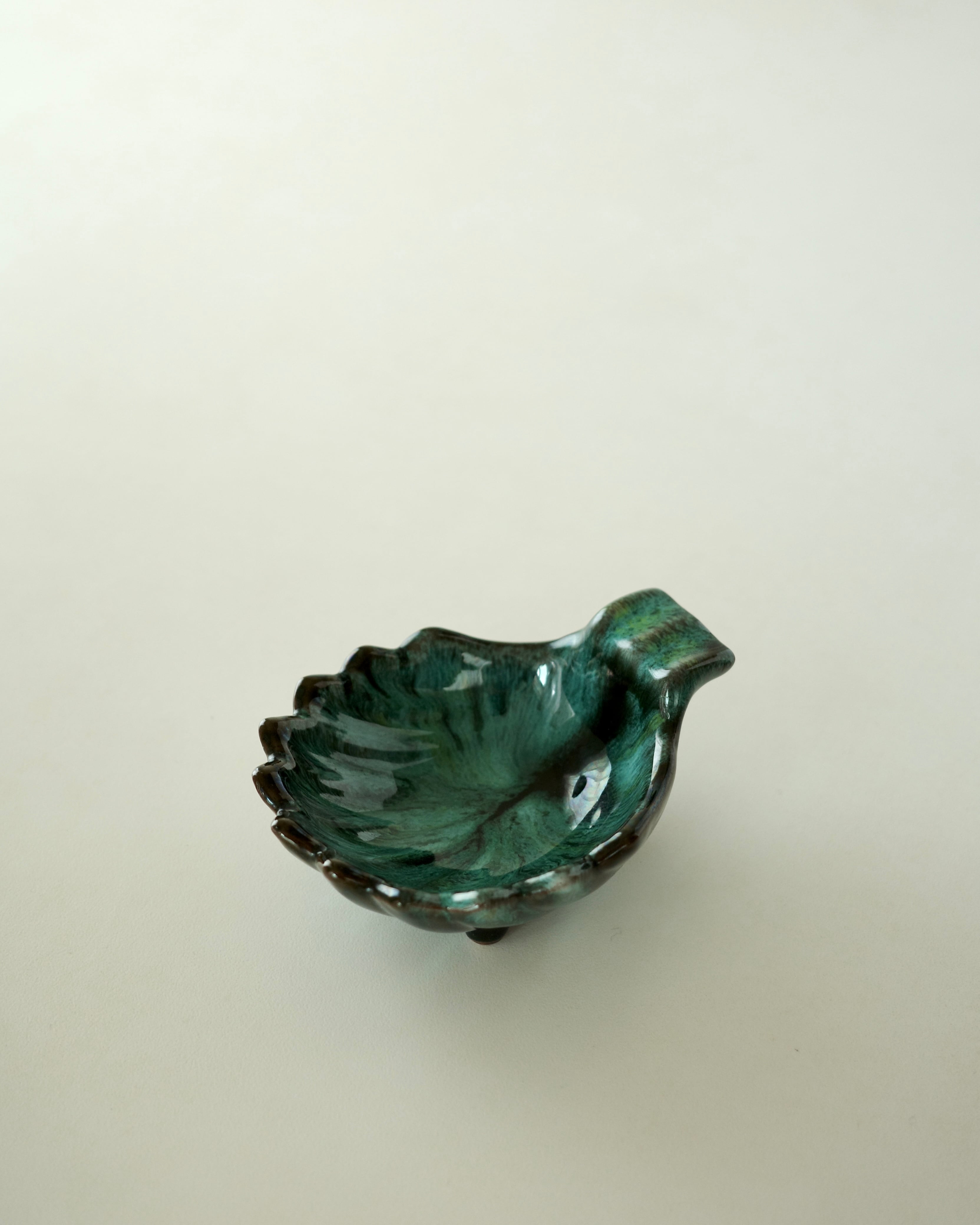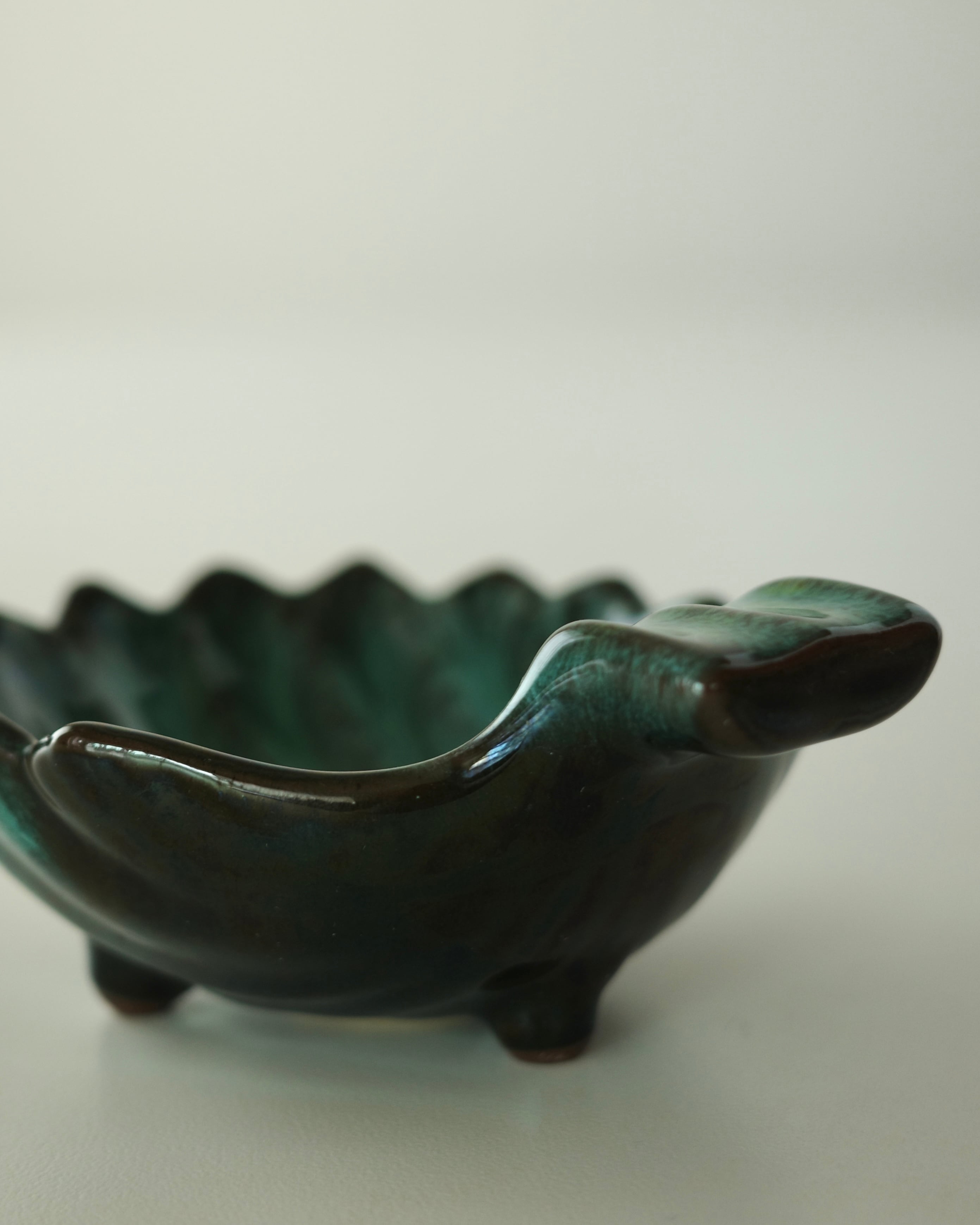 脚付きのユニークなシェル型に、ブルーグリーン×ブラックの深みのある色合い。