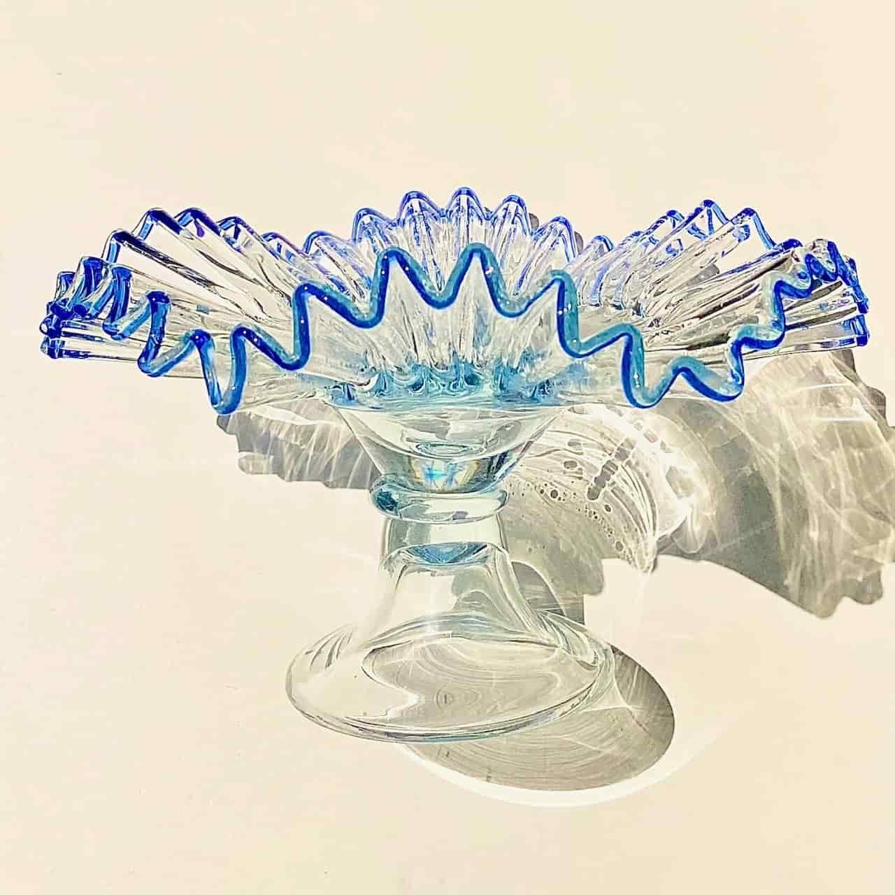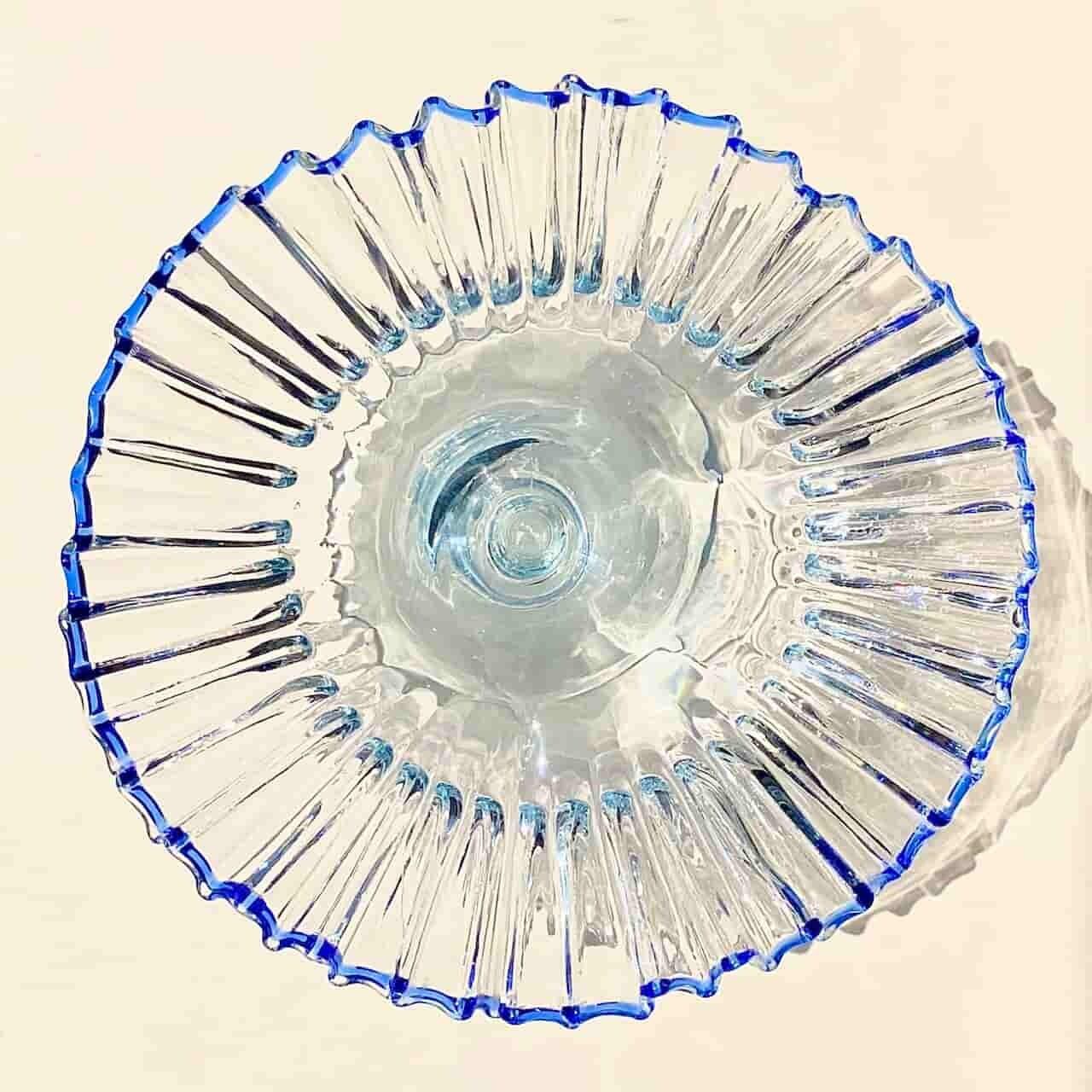 ピリッと効いたフチのブルー、光に当たるとうっすら水色がかって見える全体のクリアなガラスが、何とも美しいコントラストを生み出しています。