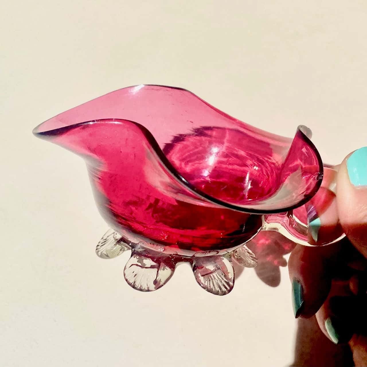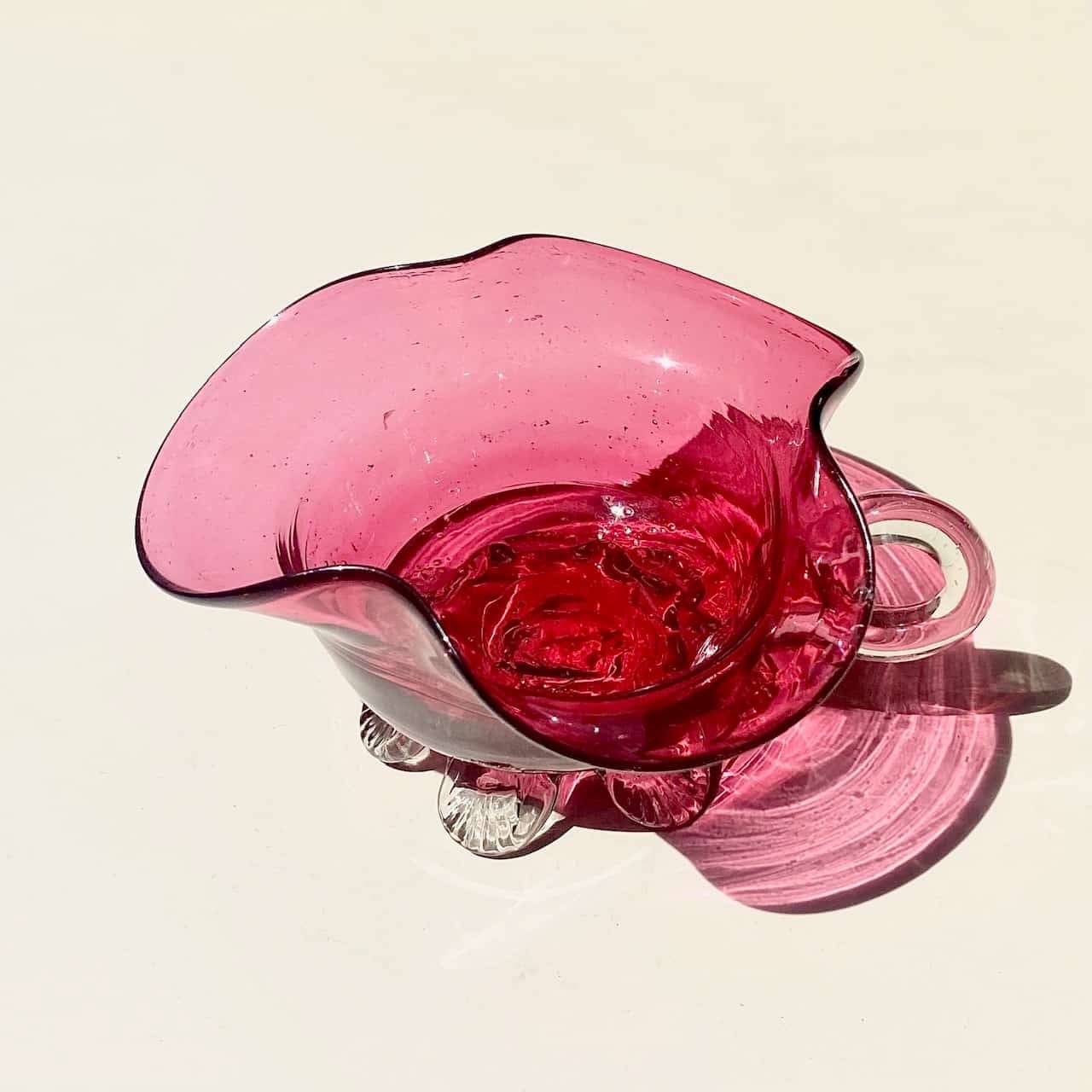 こちらのジャムディッシュは、深みのあるクランベリー色もさることながら、透明なガラスで作られたキュートな脚や持ち手、花びらのように柔らかなボウルの形も大きな魅力。