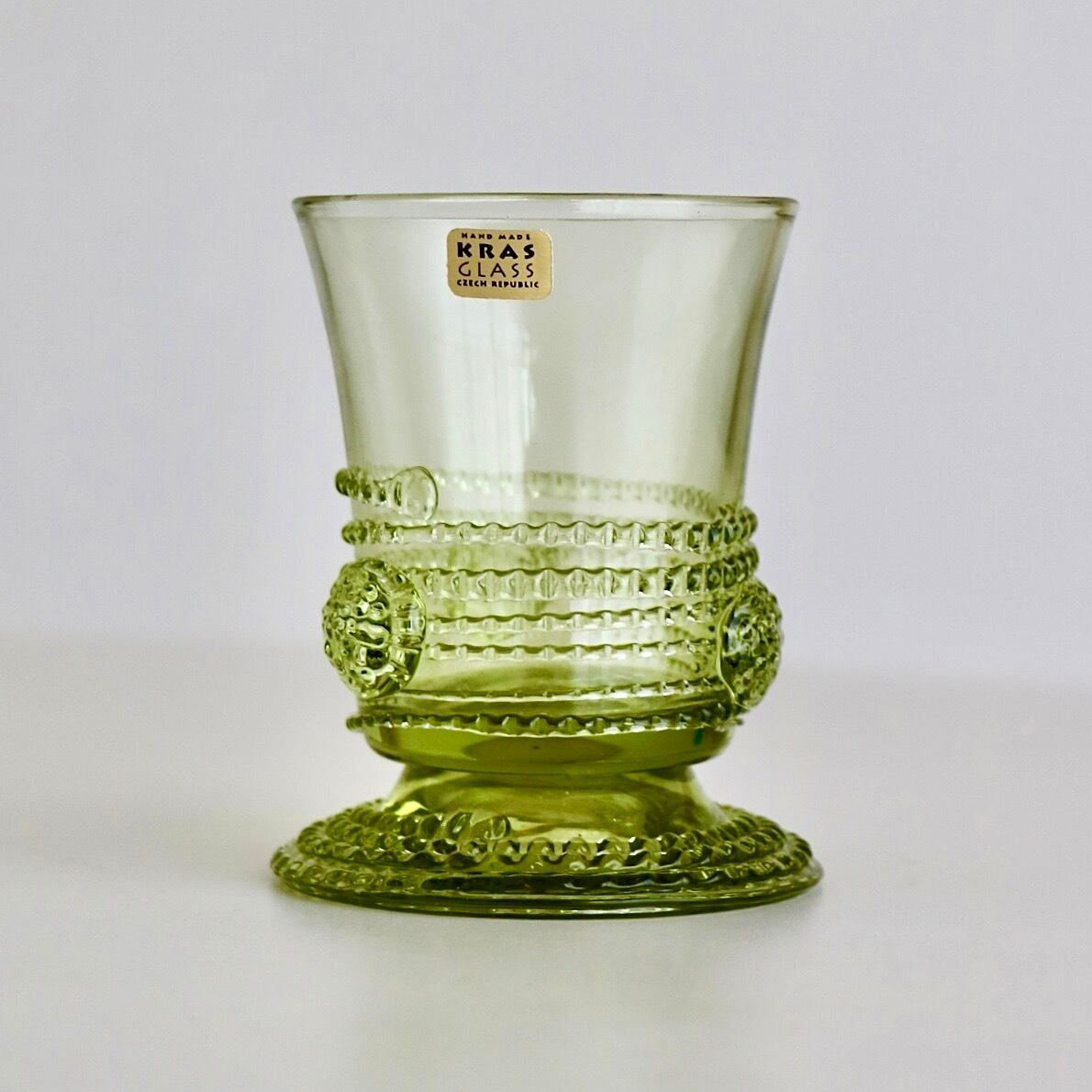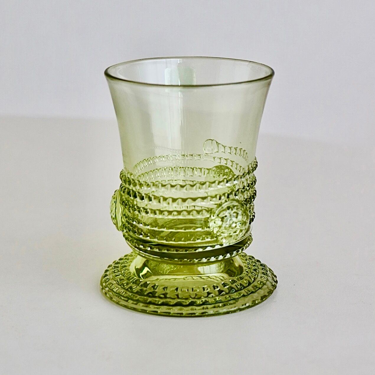 こちらのミニグラスは、全体を取り巻くように装飾が施された逸品。優しい黄緑色もたまらなく美しい、、、!