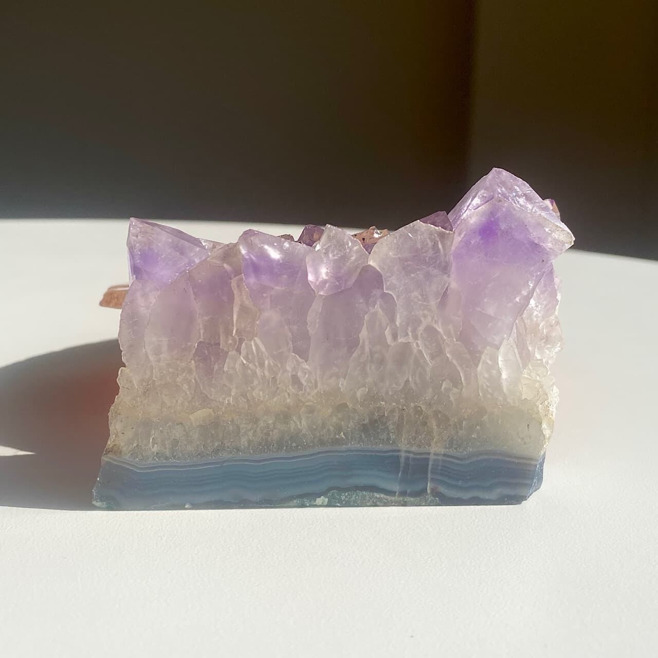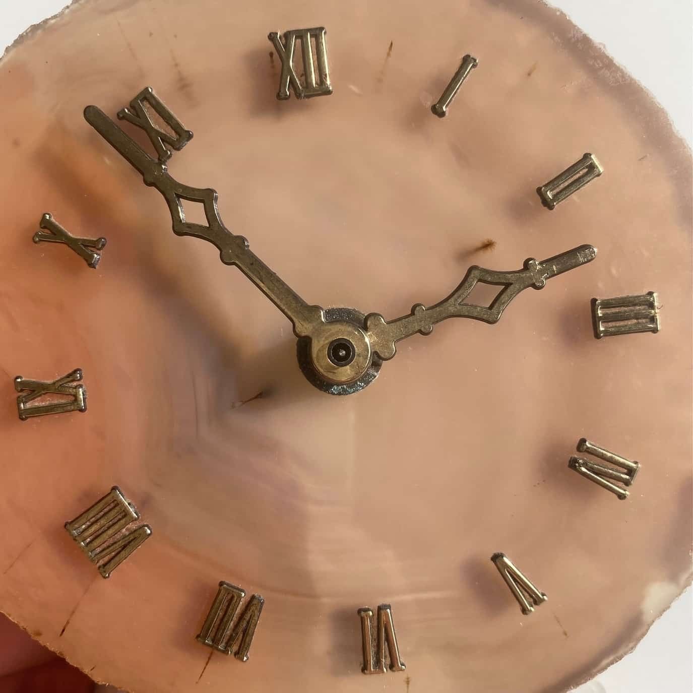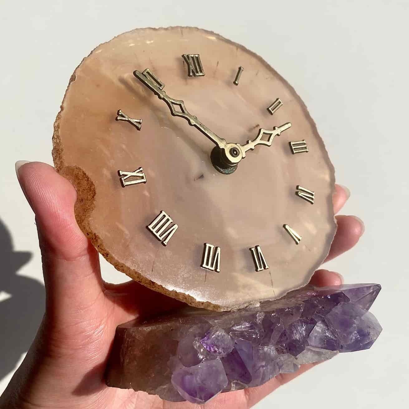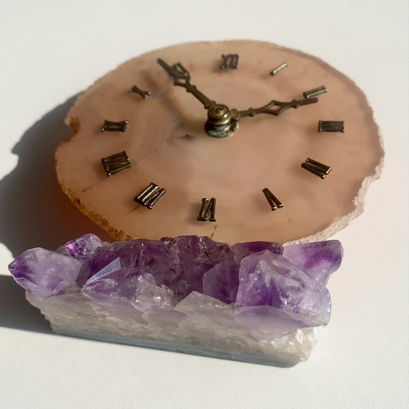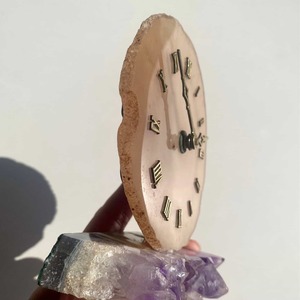 アゲートの文字盤にアメジストの台座と、天然石が贅沢に使われています。