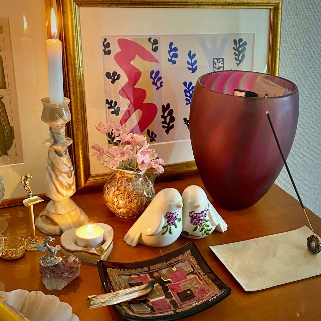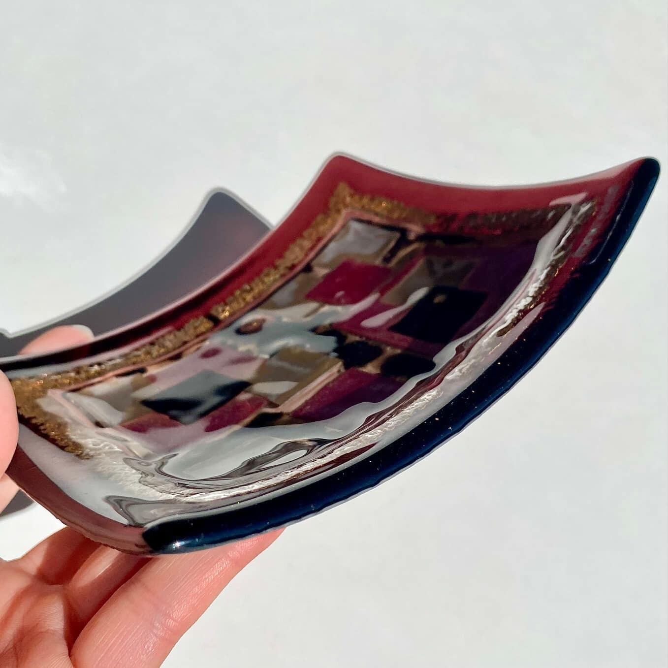 プラムパープルのぷっくりしたガラスの中には、ランダムな正方形やゴールドの装飾が施されていて、とってもユニークです。