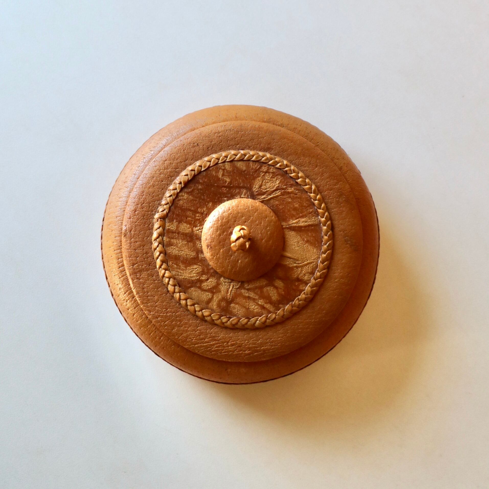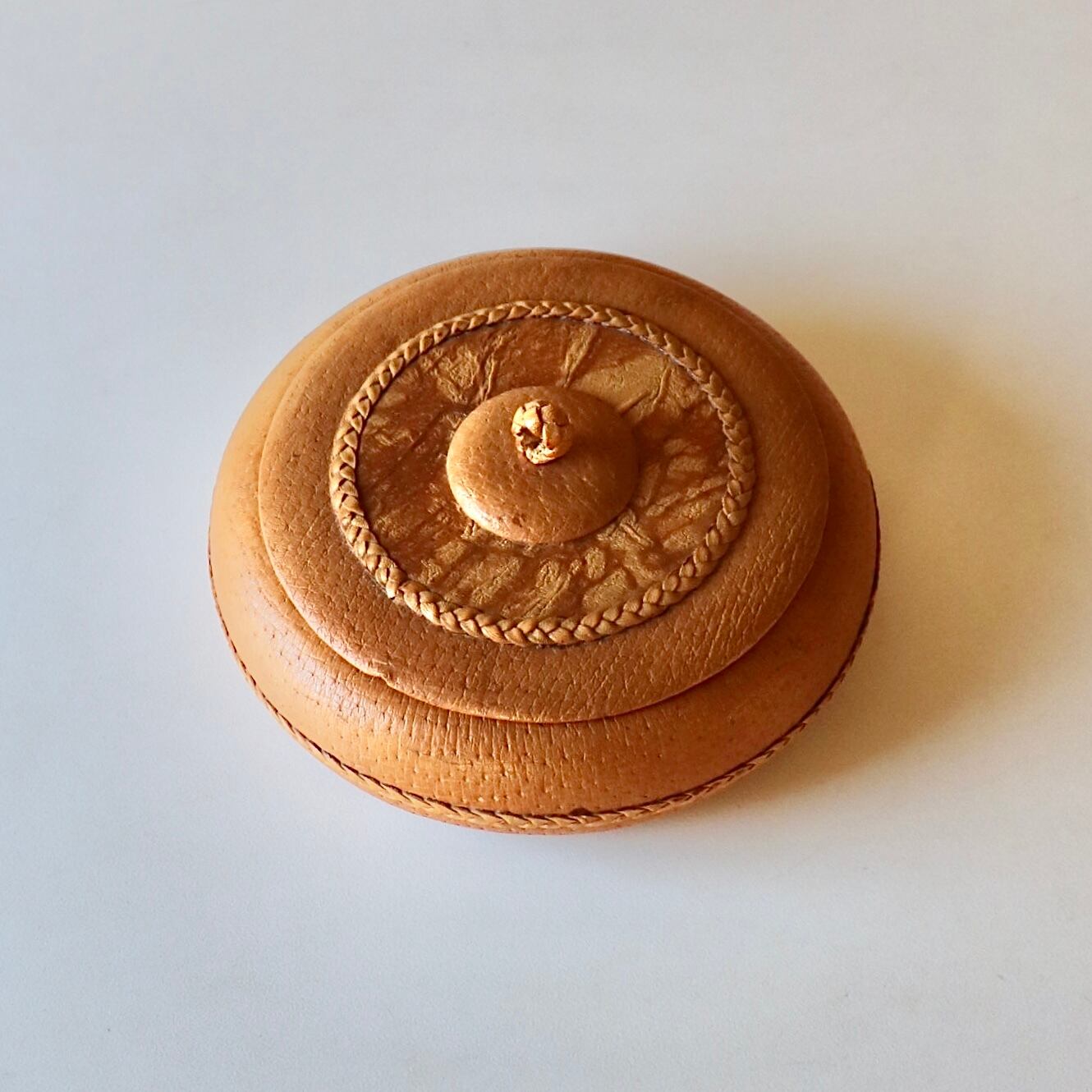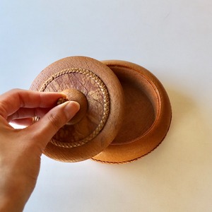 経年に伴う細かな傷や汚れに加え、蓋部分に小さな凹み・レザーの剥がれが見られます。