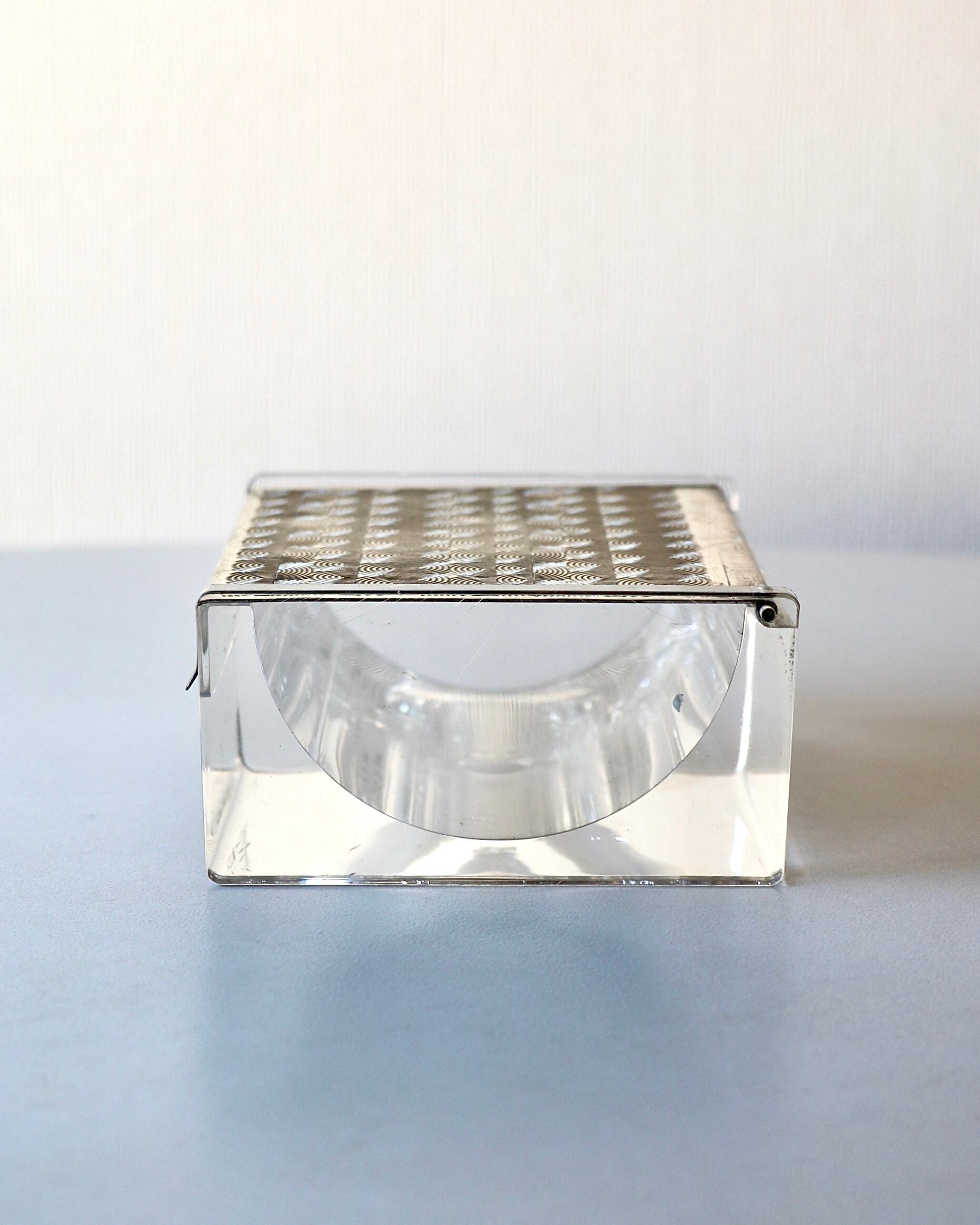 プレキシガラスというアクリル樹脂製のガラスに、銀メッキの蓋でできています。